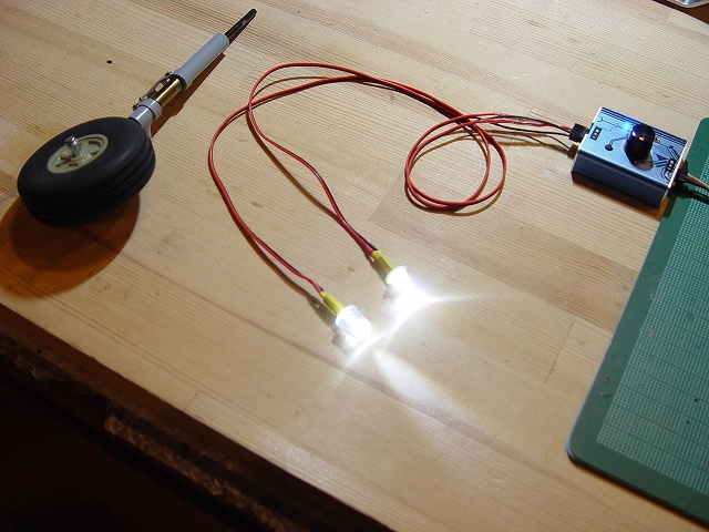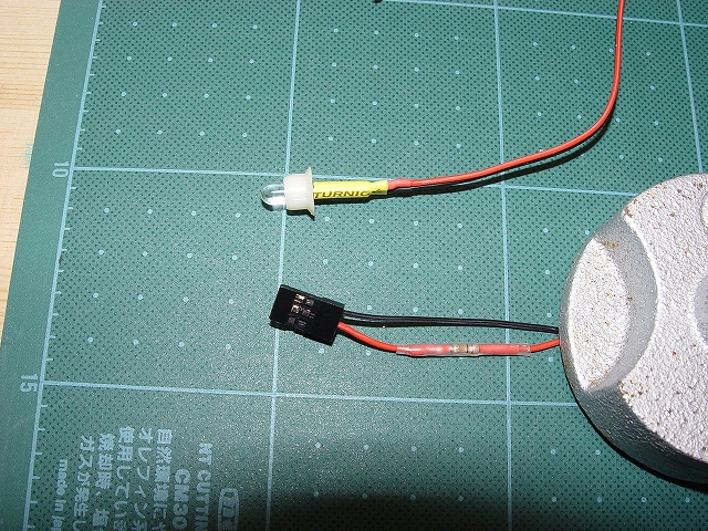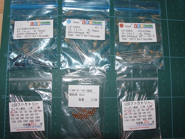 RC機の着陸灯や翼端灯などに便利です。 まずはLEDの基礎知識ですが、こちらのHPをご覧ください。 http://kenkitami.tonosama.jp/leds/led_parts_.html そして用意するものは 1. 画像の上部にあるLED、抵抗、配線、コネクター(これ以外にヒートシュリンクTUBE)で下部の部品はあれば便利です。 2. LEDに下部の部品を組んだ画像です。 3. LEDの長い足が+なので赤いコードを、短い方が-で黒いコードを半田付けしてシュリンクチューブでカバーします。 そして+コードのコネクター手前には抵抗を半田付けしてシュリンクチューブでカバーします。 RX用BATTで点灯させました。 LEDには白、赤、緑があり、明るさの違いmcd、照射角の違い°、形状の違い、点灯か点滅での違いで各種あります。 仮にRX電源を使ってLEDを点灯させる場合は各LEDにかかれているVf:順電圧ex赤2.2/緑3.2/白3.4となるように抵抗を取り付けます。 RX電源5V-----赤LED(Vf:2.2)抵抗150Ω 緑LED(Vf:3.2)抵抗91Ω 白LED(Vf:3.4)抵抗82Ωを付けますが、近い値の抵抗を使っています。 なおLED用品は画像のLED PARADISEやLEDファクトリーで購入しました。 PR |