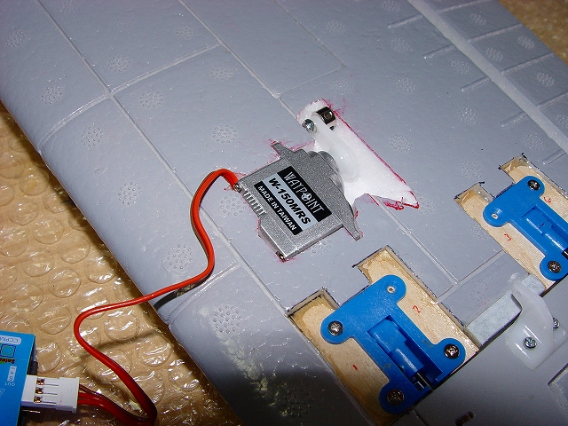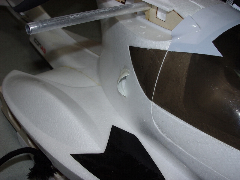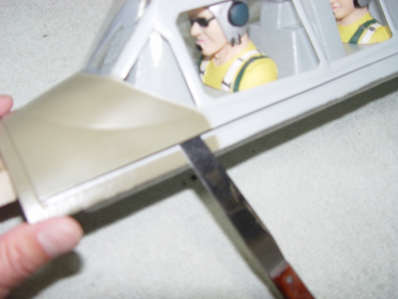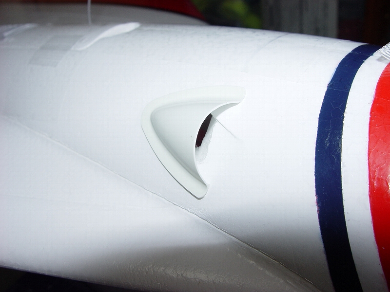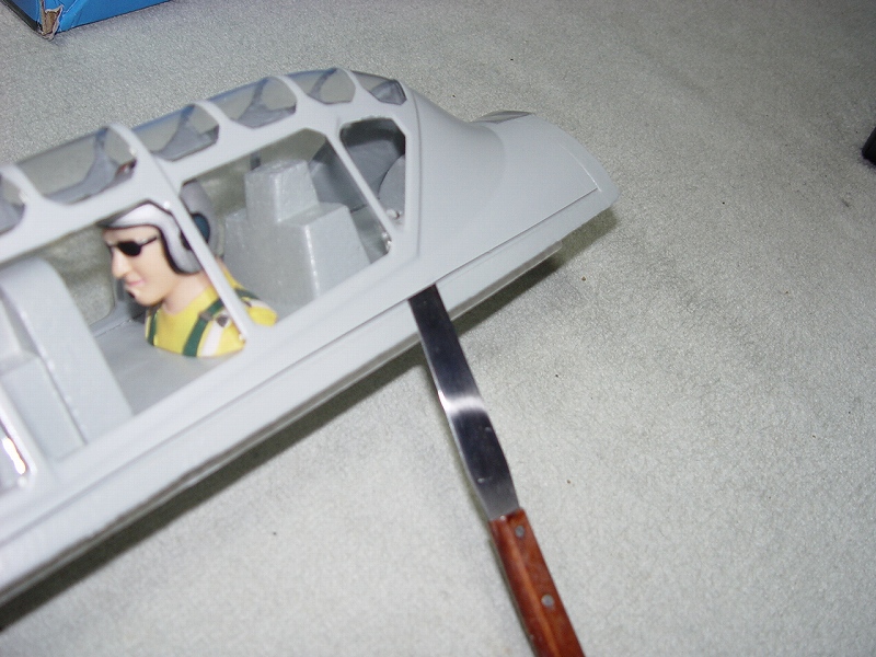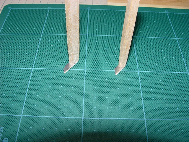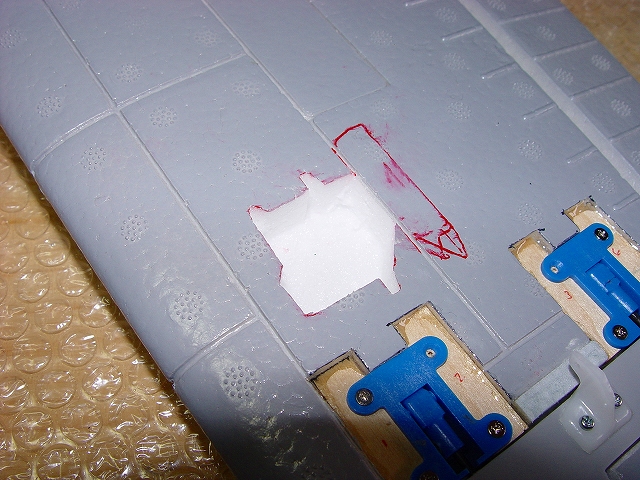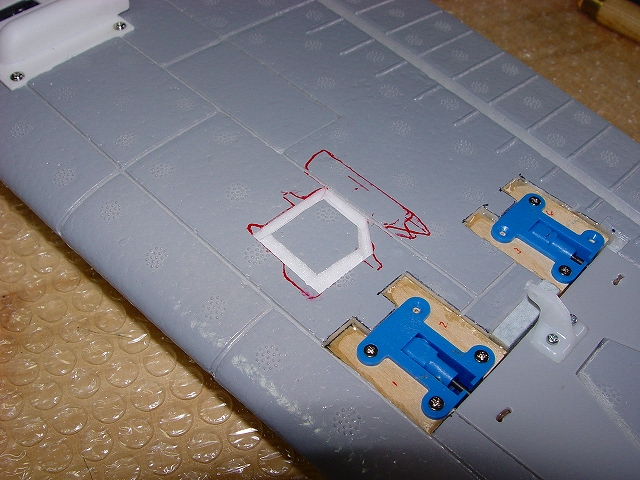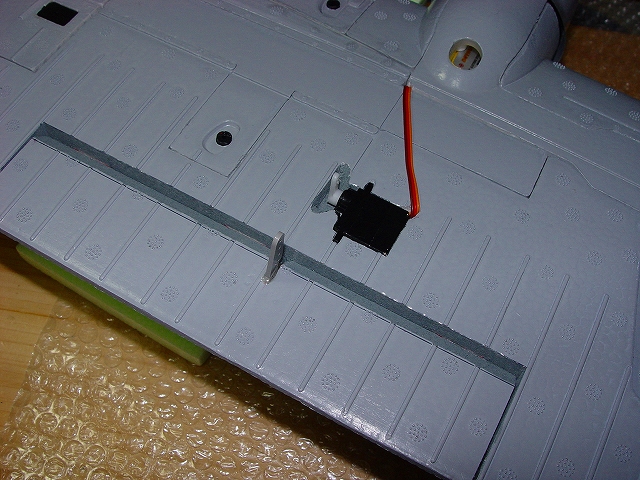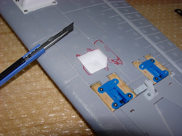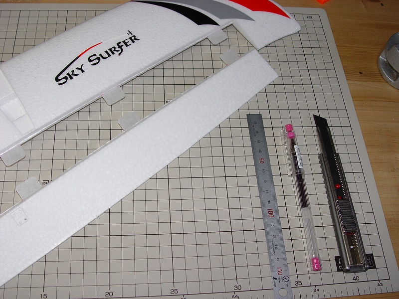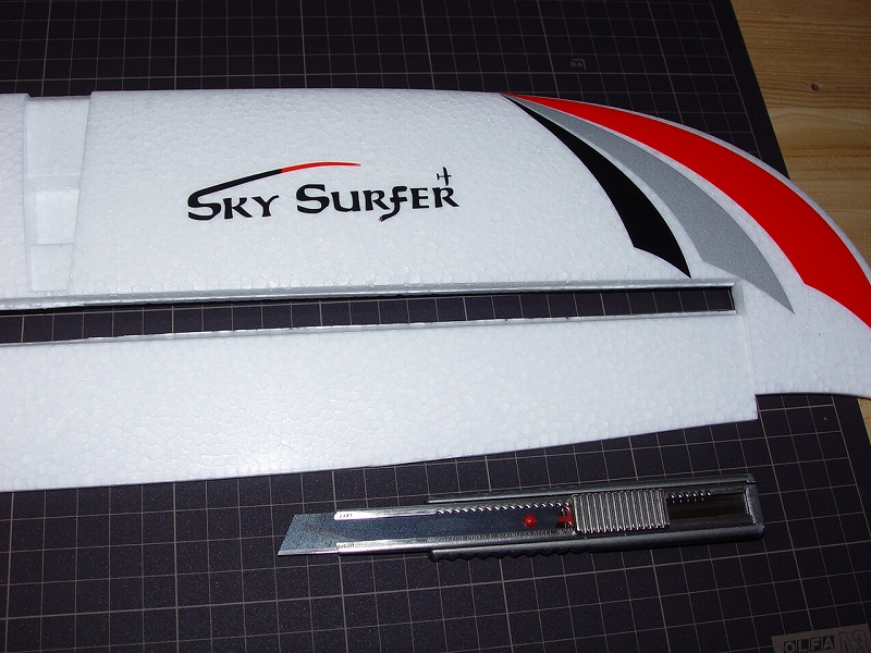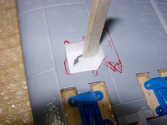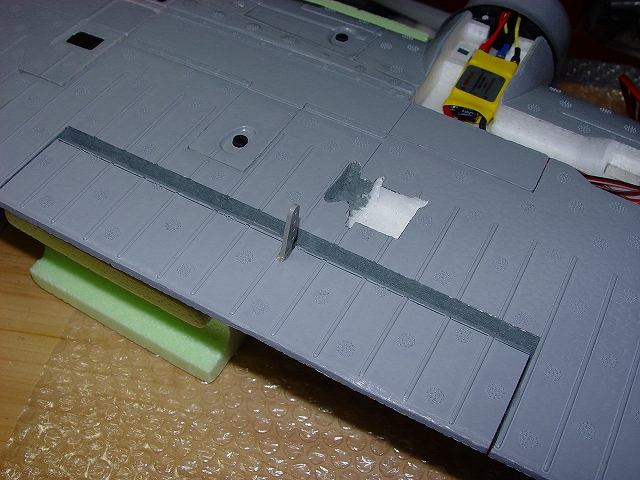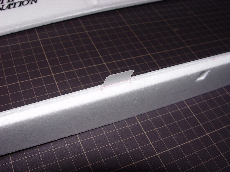 良く切れる薄刃のカッターで発泡ヒンジの中央部分を切ります。 その発泡ヒンジは2mmくらいの厚さがありますので、中心線を0.3mmHI-TECペンで書き、薄刃カッターでイージーヒンジ用の切れ目を入れます。(水平尾翼とエレベーター側の両方) すべてのヒンジ(ここでは5箇所)を差し込んだ後で、エレベーターを付けてみて段差がないことを確認します。 次にカッターでの切り口をサンドペーパーで仕上げます。 いよいよヒンジの接着です。まずはエレベーター側にヒンジを少し差し込んで発泡用のCAをつけ、半分ほど差し込んで接着します。(素早く決めないと固まります) そして水平尾翼側は6分間エポキシを用意して、同じように少し差し込んだ状態でヒンジ部分の表裏に爪楊枝でエポキシを塗って、3mmくらい隙間が残るまで差し込みます。ここで綿棒を使いイージーヒンジに残ったエポキシを取り除きます。さらに完全に押し込んだ後でエレベーターを上下に動かし、必要な隙間を作り、エポキシが固まれば完成です。これで安心して飛ばせます。 |