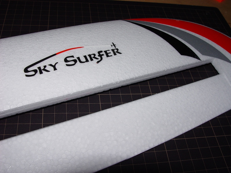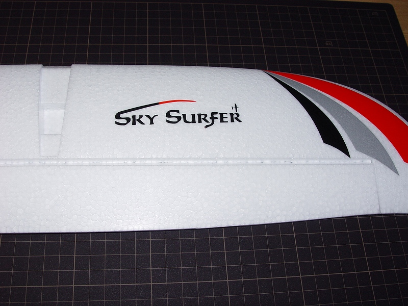 最近のEPO(硬質発泡)製の機体では、ヒンジ部分も発泡となっている機体があります。発泡の型で作られるので、形も精度もありますが、長い間使っているとヒンジ部分が切れて操縦不能で墜落したのも目撃しました。私は、発泡のヒンジは原則イージーヒンジや棒ヒンジと交換しています。それでは今回完成させたSKY SURFERを例に説明します。これはエレベーターのヒンジです。