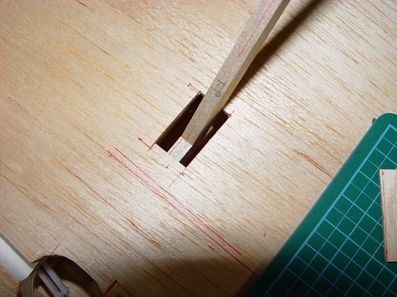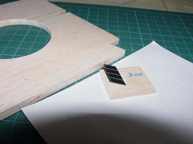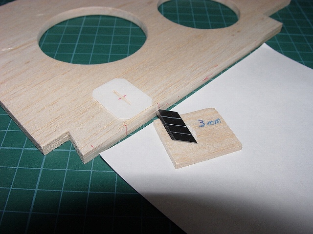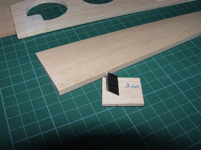 今までは、スケールで罫書きカッターでヒンジが入るスリットを開けていましたが、真ん中に開けるのは困難で、エルロン等を組むと段差ができます。カッターでスリットを切り直して段差をなくしていました。 クラブの先輩から簡単な方法を聞きました。 水平尾翼とエレベーターを例に説明します。 水平尾翼の後縁とエレベーターの前縁は6mmです。 3mm厚さのバルサ板の切れ端を用意してカッターの刃の厚み程度をサンディングしてNTカッターの刃を接着します。 平らな板の上で画像のように罫書き、さらに深くはカッター本体で切れ込みを入れます。 注意するのは水平尾翼もエレベーターも上下を同じにすることです。 もしヒンジラインが中心からずれても、同じ方向にずれるので、 ヒンジを付けると狂いがありません。 一度試してください、あっという間にヒンジが付きます。 |